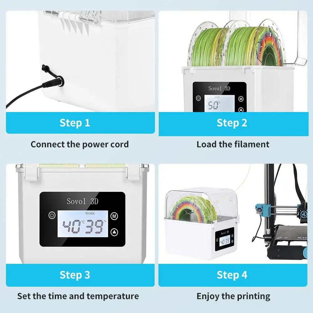 Mondjon búcsút a bosszantó nyomtatási hibáknak és a csúnya eredményeknek, és engedje szabadjára 3D-nyomtatójában rejlő lehetőségeket! A Sovol Filament szárítódoboz megvédi nyomatait a nedvességtől, és megakadályozza a szálak, buborékok vagy egyenetlen extrudálási vonalak kialakulását.